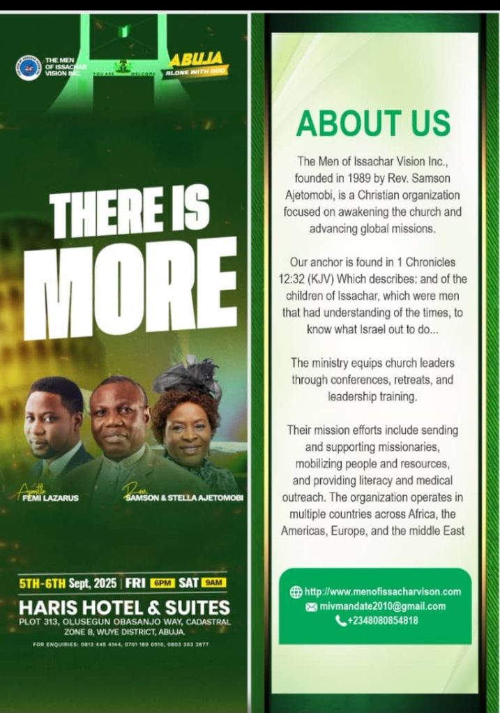 In the retreat titled: ”There is More”, Rev. Ajetunmobi, alongside his wife, Pst. Mrs. Stella Ajetunmobi and Pst. Lazarus will be ministering under power and the anointing of the Holy Spirit.