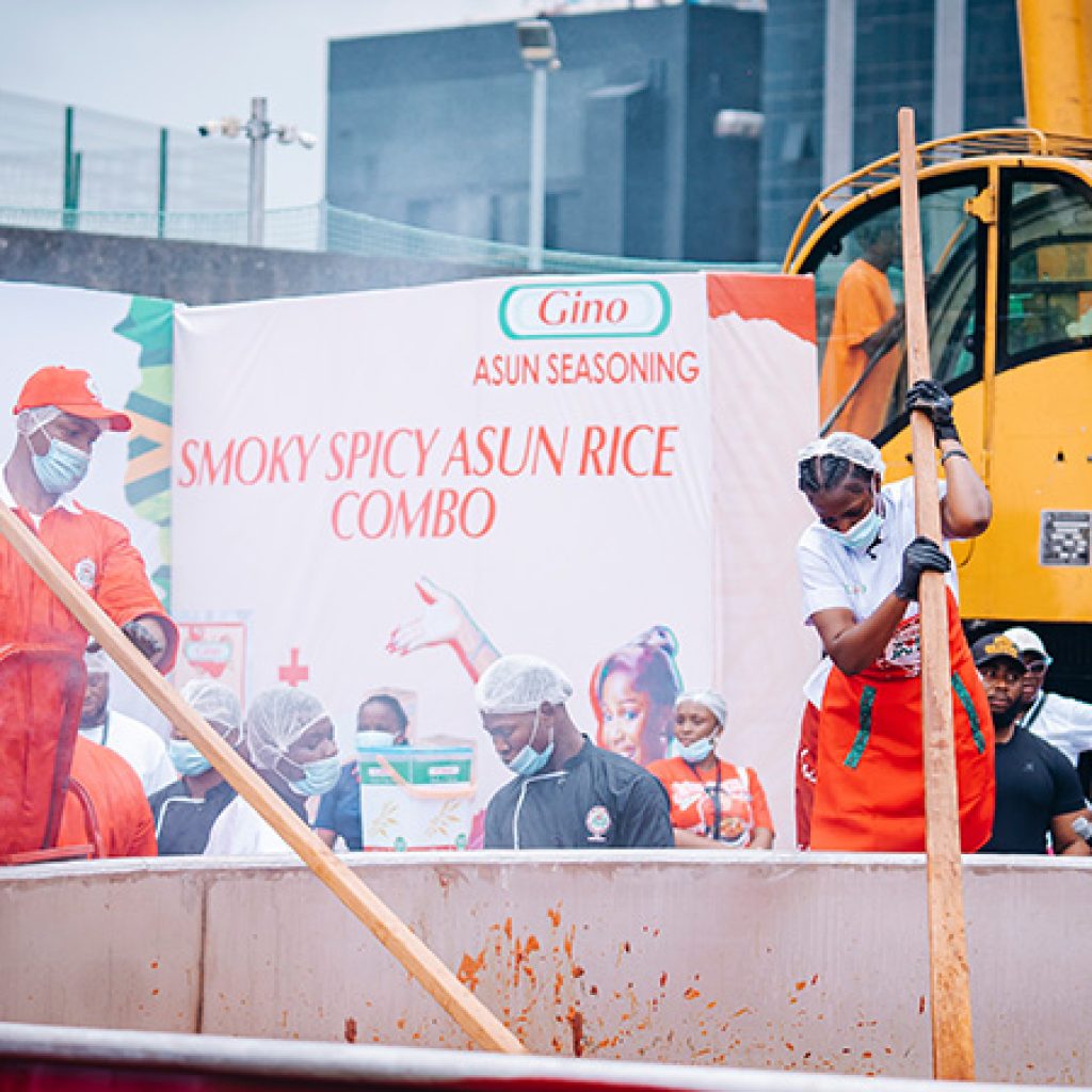 “New record: Largest serving of Nigerian-style jollof rice – 8,780 kg (19,356 lb 9 oz) achieved by Hilda Baci and Gino in Victoria Island, Lagos, Nigeria.”